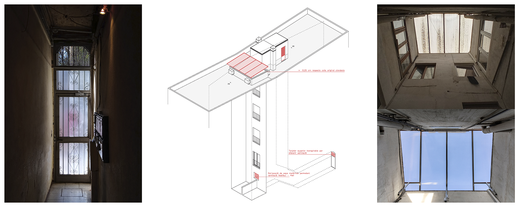 ︎ Obertura de targeters, substitució de portes opaques o no ventilades, trasdossat ventilat de murs de vestíbul i substitució de la cobertura d’un pati de llums (ventilació i il·luminació)